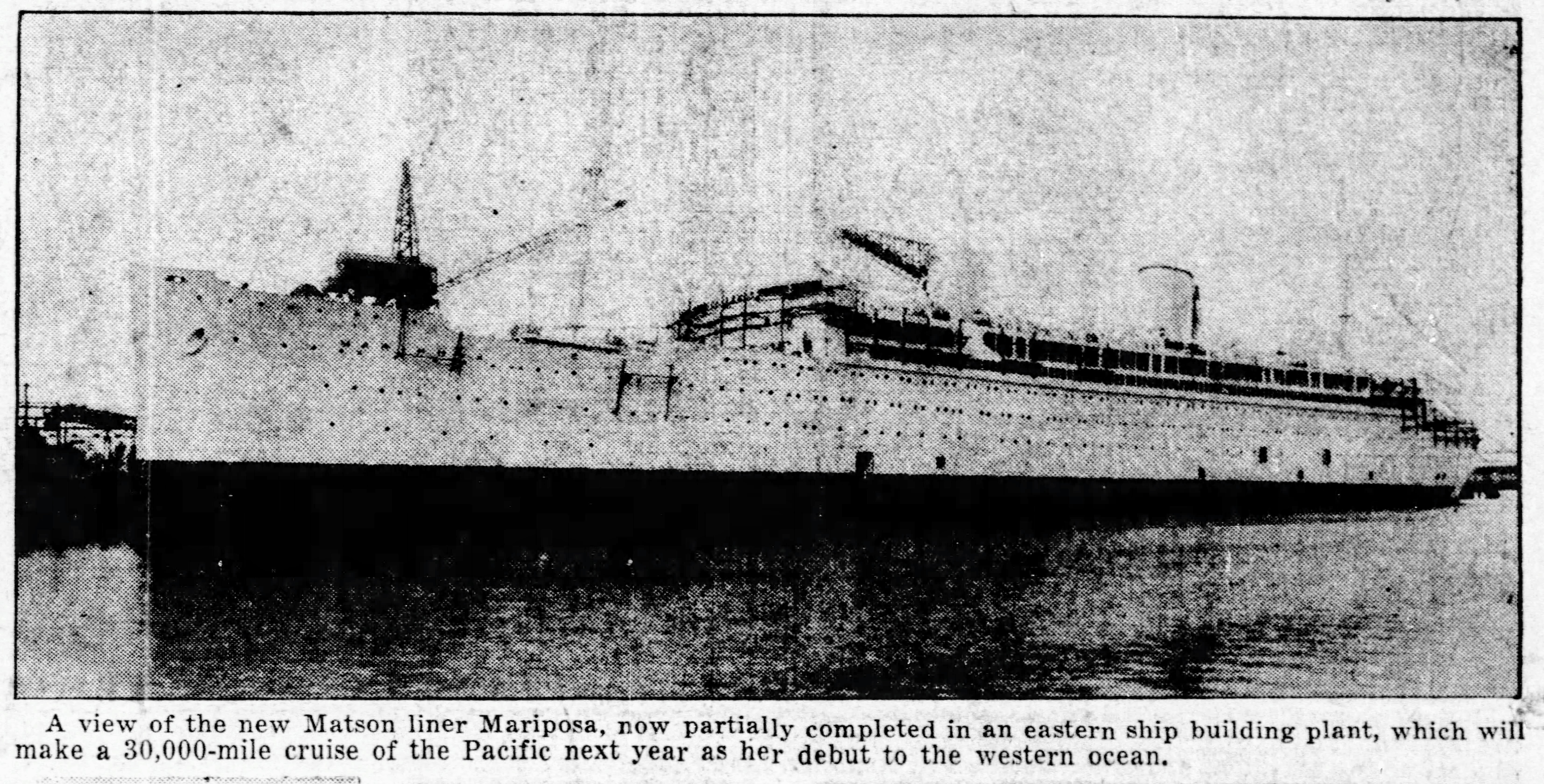 The Honolulu Star-Bulletin of 3 August 1931 used this splendid photo to report on the launch of Mariposa. |