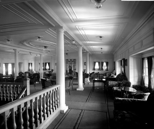 So it was that Babcock & Wilcox, best known of course for its boilers, concocted an ingenious jib-boom type deck-mounted crane type davit. This would, uniquely, move and lower any number of nested lifeboats on either side of the ship, either individually or in tandem with the davit on the other side of the ship. This worked with the patented nested-boat concept developed by Capt. P.D. Murray of Liverpool which stacked wooden boats of 30 ft., 28 ft. and 26 ft.to accommodate 170 persons total with three boats or 135 with two. Canadian Pacific were among the first to adopt this to some degree in Empress of Russia and Empress of Asia of 1913 although at conventional davits. Now, with Missananbie and Metagama they combined the idea with the new Babcock and Wilcox system with a pair of the new davits aft on the Boat Deck to work a set of four "nests' of boats.In addition, the ships, following the lead of Alsatian and Calgarian, had one motor lifeboat.