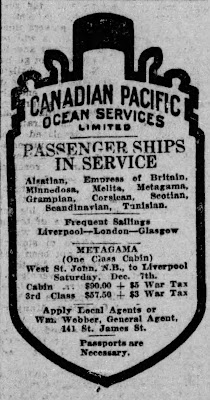 It was announced on 20 February that Metagama would additionally call at Halifax on her crossing from St. John which was put back to 28 February to allow for the call there on 1 March.